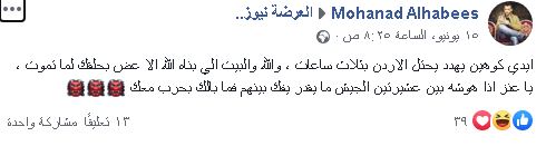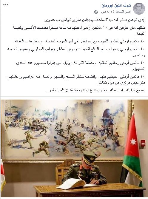 أحداث اليوم - ردّ نشطاء أردنيون عبر مواقع التواصل بغضب وسخرية على تغريدات الصهيوني المتطرف إيدي كوهين، والتي قال فيها "متوهماً" إنه قادر على اختراق الحصن الأردني بدبابتين.