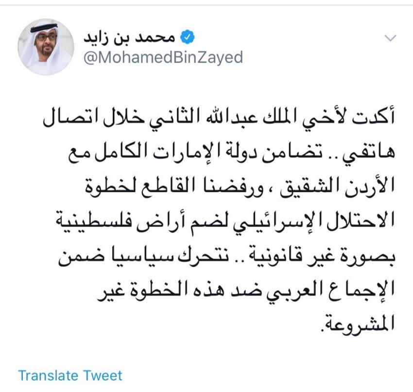 وقال بن زايد عبر تغريدة له على تويتر " أكدت لأخي الملك عبدالله الثاني خلال اتصال هاتفي .. تضامن دولة الإمارات الكامل مع الأردن ، ورفضنا القاطع لخطوة الاحتلال الإسرائيلي لضم أراض فلسطينية بصورة غير قانونية .. نتحرك سياسيا ضمن الإجماع العربي ضد هذه الخطوة غير المشروعة.