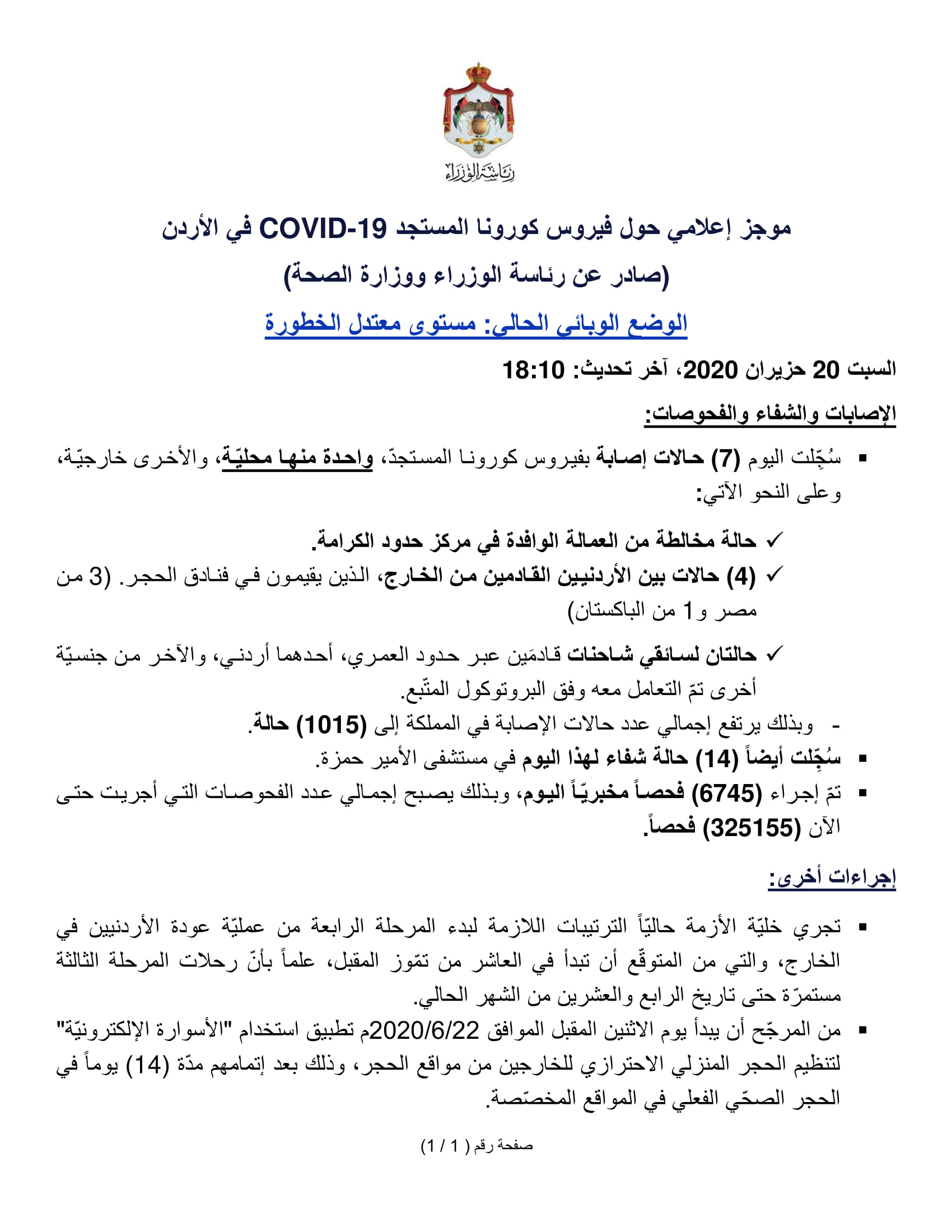 وجاءت الاصابات على النحو الآتي: حالة مخالطة من العمالة الوافدة في مركز حدود الكرامة. - (4) حالات بين الأردنيين القادمين من الخارج، الذين يقيمون في فنادق الحجر. (3 من مصر و1 من الباكستان) - حالتان لسائقي شاحنات قادمَين عبر حدود العمري، أحدهما أردني، والآخر من جنسيّة أخرى تمّ التعامل معه وفق البروتوكول المتّبع. - وبذلك يرتفع إجمالي عدد حالات الإصابة في المملكة إلى (1015) حالة. - سُجِّلت أيضاً (14) حالة شفاء لهذا اليوم في مستشفى الأمير حمزة. - تمّ إجراء (6745) فحصاً مخبريّاً اليوم، وبذلك يصبح إجمالي عدد الفحوصات التي أجريت حتى الآن (325155) فحصاً.
