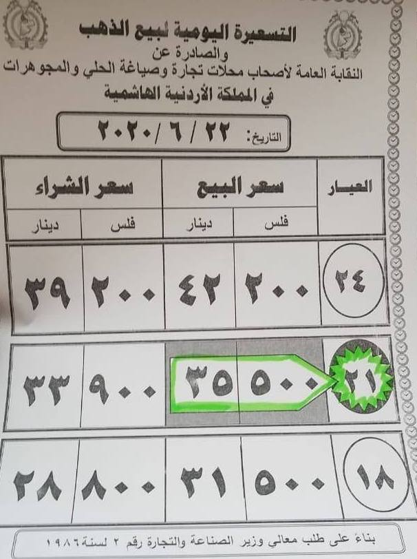 فيما بلغ سعر بيع الغرام من الذهب عياري 24 و18 لغايات الشراء من محلات الصاغة عند 42.20 دينارا و 31.50 دينارا.