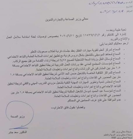 كما أوصى جابر بزايدة السعة التشغيلية لوسائل النقل العام بنسبة 75% شريطة التزام الركاب بارتداء أقنعة الوجه. كما أوصى بالسماح بتشغيل مكتبة عبدالحميد شومان بشرط تحقيق شرط التباعد في القاعات
