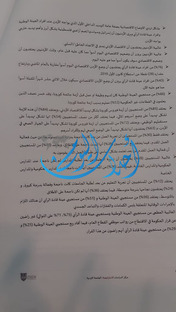 وقال 85% إنهم يرون أن أزمة كورونا تشكل تهديداً للإقتصاد الأردني، فيما قال 84% أن الجائحة تشكل تهديداً لوضع اسرهم المالي.