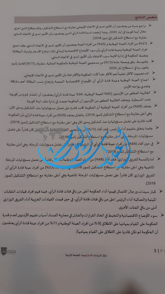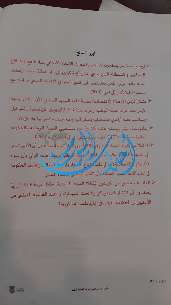 وبينت نتائج الإستطلاع تراجعا في عدد من يعتقدون أن الأمور تيسير بالإتجاه الإيجابي، وأن تردي الأوضاع الإقتصادية كان التهديد الداخلي الأول عن الأردنيين، فيما كانت سياسات وخطط الإحتلال لضم اجزاء من الضفة الغربية التهديد الأهم الخارجي .