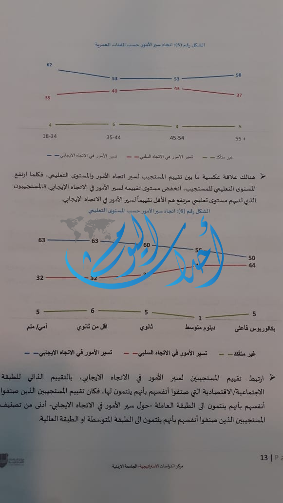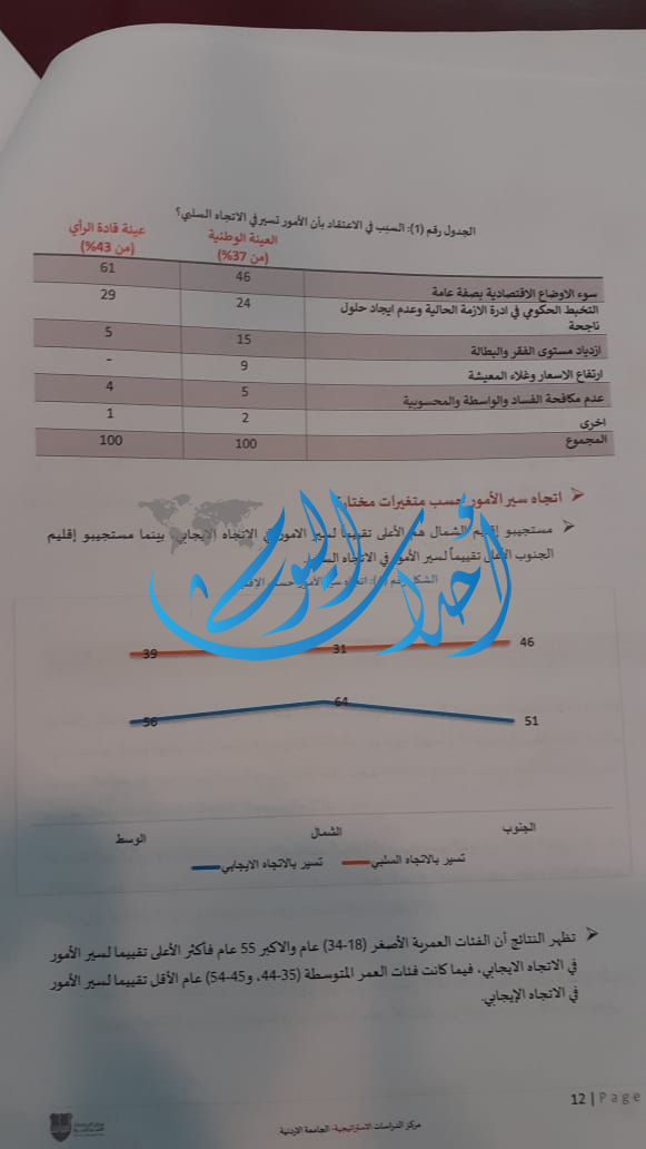 - (37%) من أفراد العينة الوطنية و (43%) من افرادا لعينة يعتقدون أن الأمور تسير في الاتجاه السلبي، وقد اجمع افراد العينة الوطنية وعينة قادة الرأي بأن سوء الأوضاع الاقتصادية (بما في ذلك ارتفاع الأسعار وازدياد البطالة) وتخبط الحكومة في إدارة الازمة سبب الاعتقاد بأن الأمور تسير في الاتجاه السلبي