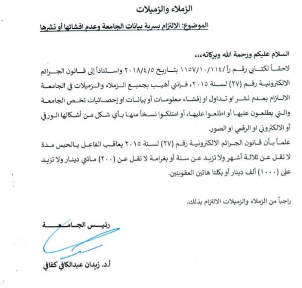أحداث اليوم - عمم رئيس جامعة اليرموك زيدان كفافي على الكوادر العاملة بالجامعة عدم نشر او تداول او افشاء معلومات او بيانات احصائيات يطلعون عليها تخص الجامعة.