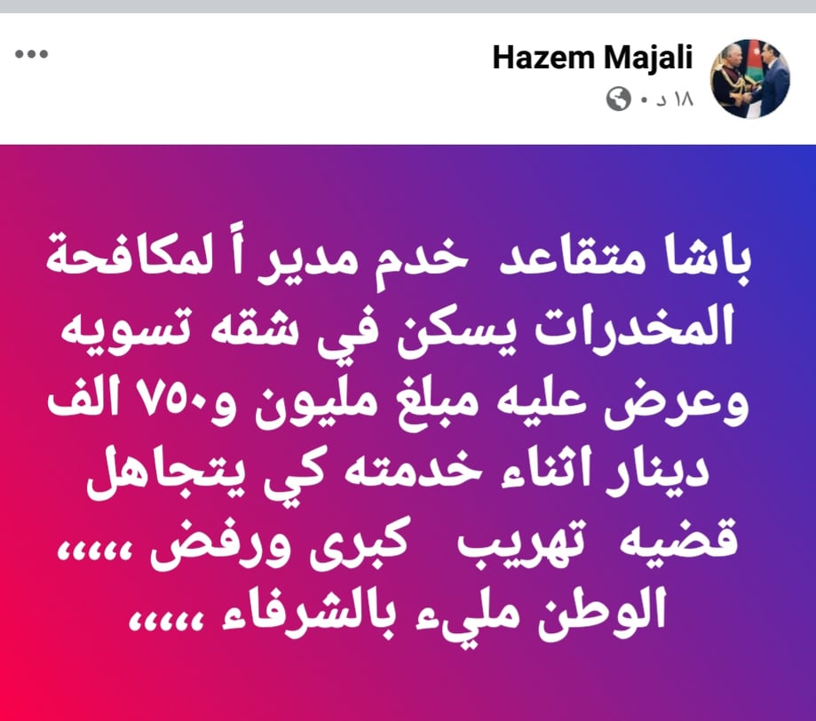 حيث أورد النائب المجالي في منشوره قائلا : "باشا متقاعد خدم مديراً لمكافحة المخدرات يسكن في شقة تسوية وعرض عليه مبلغ مليون و750 ألف دينار أثناء خدمته كي يتجاهل قضية تهريب كبرى ورفض.. الوطن مليء بالشرفاء".