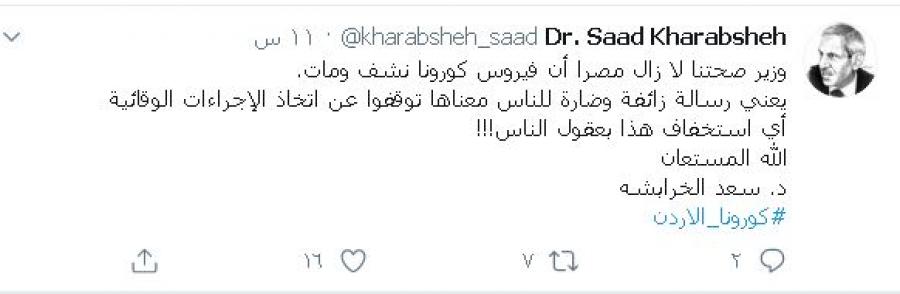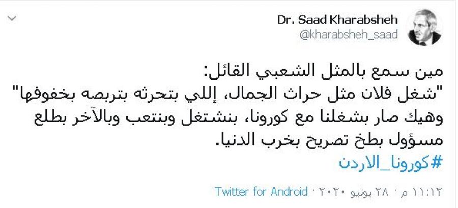 وكان من أبرز التصريحات تغريدة لوزير الصحة الأسبق الدكتور سعد الخرابشة، قال فيها "مين سمع بالمثل الشعبي القائل: شغل فلان مثل حراث الجمال، إللي بتحرثه بتربصه بخفوفها، وهيك صار بشغلنا مع كورونا، بنشتغل وبنتعب وبالآخر بطلع مسؤول بطخ تصريح بخرب الدنيا".