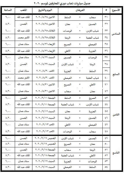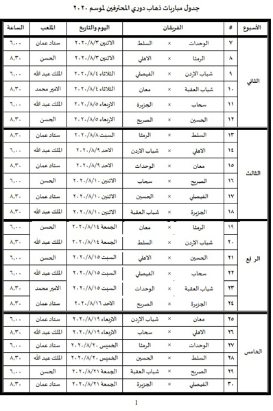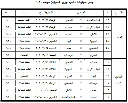 أحداث اليوم - أصدر الإتحاد الأردني لكرة القدم، الإثنين، جدول مباريات ذهاب دوري المحترفين الأردني لكرة القدم لموسم 2020.وفي ما يلي جدول المباريات المعلن عبر الموقع الرسمي للاتحاد :