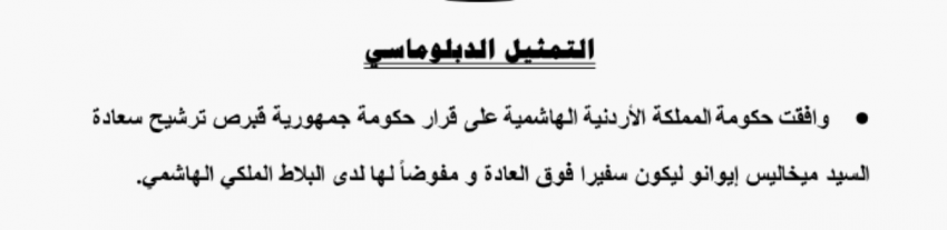 أحداث اليوم - وافقت الحكومة الأردنية على تعيين السفير ميخاليس ايوانو سفيرا فوق العادة ومفوضا لجمهورية لدى البلاط الملكي الهاشمي.