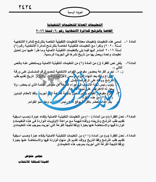 أحداث اليوم - أصدرت الهيئة المستقلة للإنتخاب تعليمات معدلة للتعليمات التنفيذية الخاصة بالترشح للدائرة الإنتخابية.ونصت التعليمات المعدلة على :
