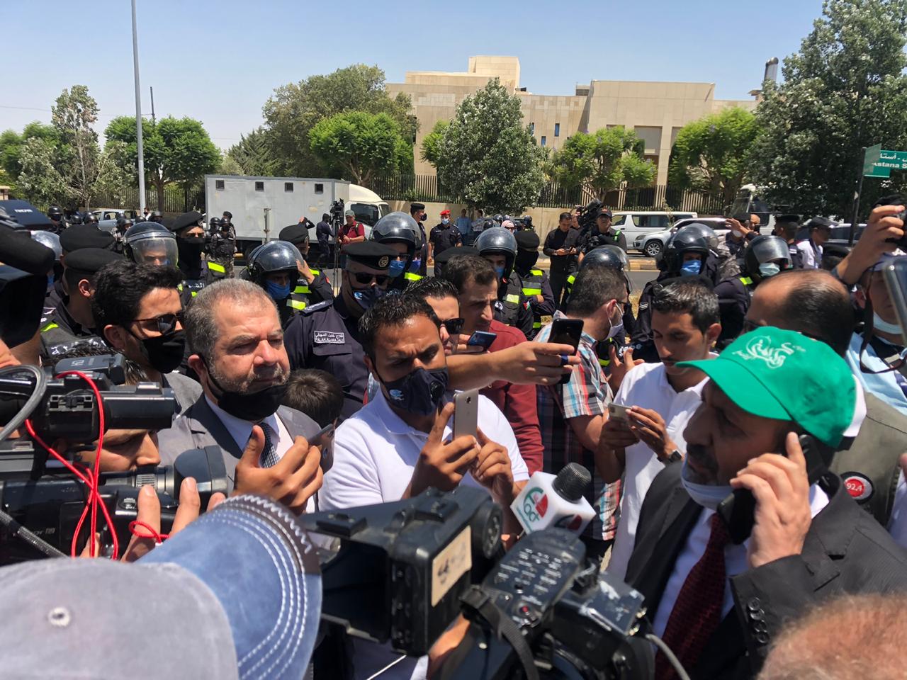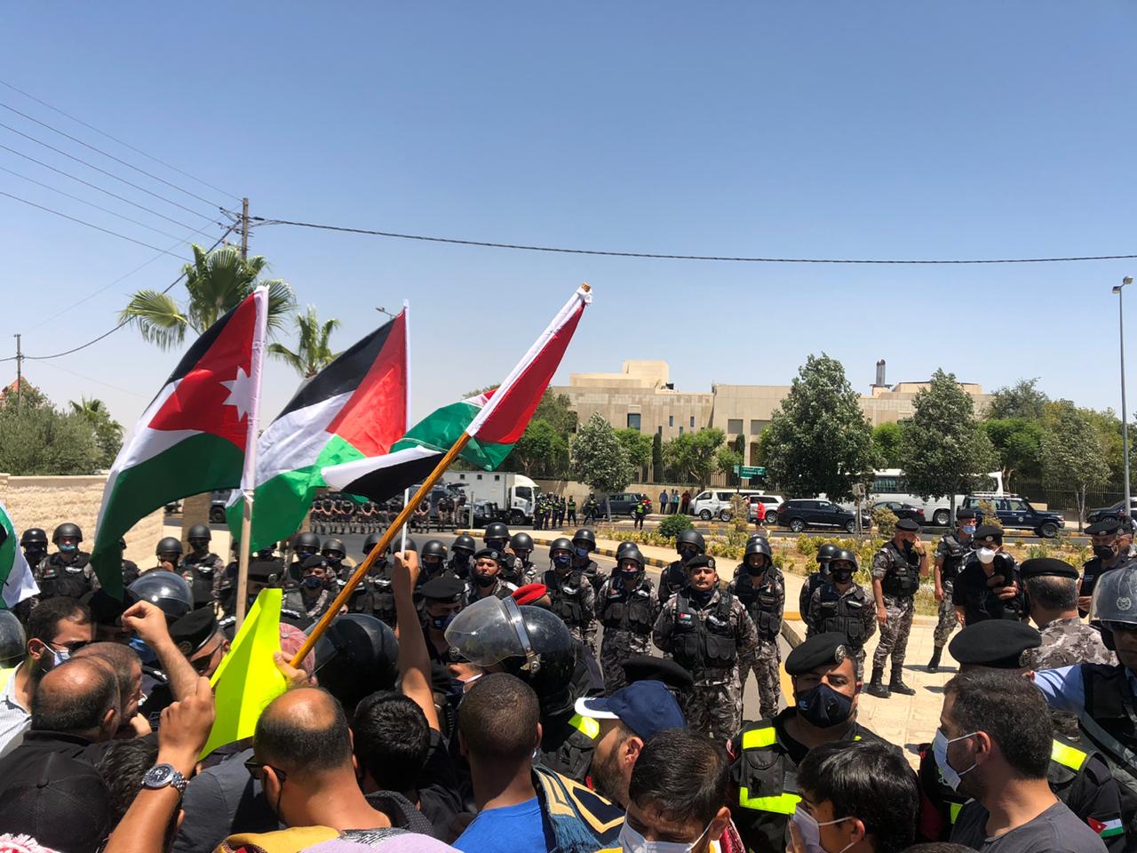 أقام التحالف الوطني لمجابهة صفقة القرن، عقب صلاة الجمعة سلسلة بشرية أمام السفارة الأمريكية في العاصمة عمان، رفضا لمشاريع الاحتلال في الأراضي الفلسطينية وآخرها، ما يتعلق بضم أجزاء من الضفة الغربية وغور الأردن.