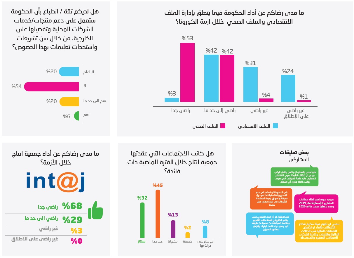 وأبدى 97 بالمئة من المشاركين في الاستبيان عن "رضاهم جدا وإلى حد ما" عن أداء جمعية "انتاج" خلال أزمة "كورونا"، في حين اعتبرت 77 بالمئة من الشركات، ان الاجتماعات التي عقدتها الجمعية خلال الفترة الماضية "ممتازة وجيدة جدا".