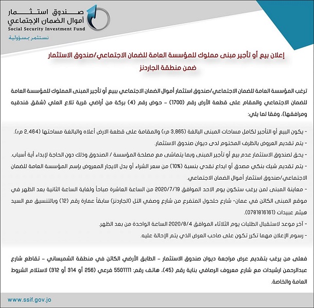 أحداث اليوم - أعلنت المؤسسة العامة للضمان الاجتماعي الأحد عن رغبتها ببيع أو تأجير مبنى مملوك لها في قرية تلاع العلي.تاليا صورة عن الإعلان: