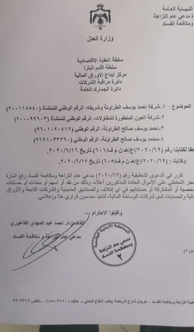 أحداث اليوم - قرر مدعي عام هيئة النزاهة ومكافحة الفساد رفع الحجز التحفظي على اموال شركات، أحمد يوسف الطراونة وشريكه، شركة العون المتطورة للمقاولات، أحمد يوسف صالح الطراونة، محمد يوسف صالح الطراونة.