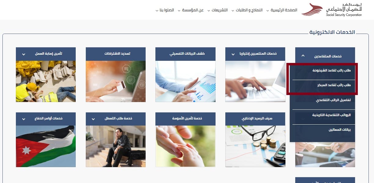 وبيّنت المؤسسة أنه يتعين على المؤمن عليه الذي استوفى شروط استحقاق الراتب التقاعدي (الشيخوخة أو المبكر) الدخول إلى حسابه الشخصي في موقع المؤسسة الإلكتروني (www.ssc.gov.jo) ومن خدمات المتقاعدين اختيار خدمة (طلب راتب تقاعد الشيخوخة أو طلب راتب تقاعد مبكر) وتعبئة البيانات المطلوبة وارفاق الوثائق وارسال الطلب.