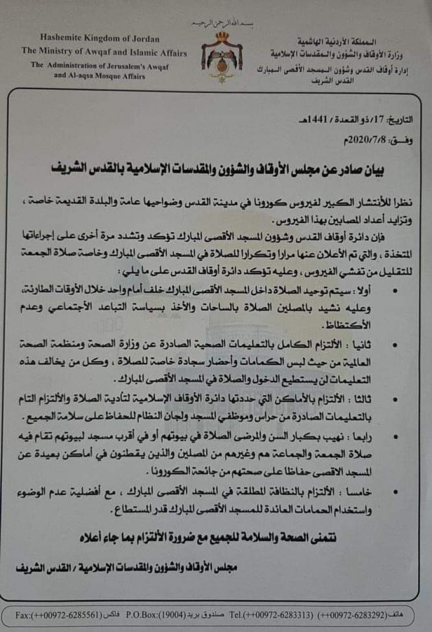 وعمم مجلس الاوقاف والشؤون والمقدسات الاسلامية بالقدس الشريف الاجراءات المتخذة للصلاة في المسجد الاقصى، بعد عودة انتشار كورونا في مدينة القدس وضواحيها عامة والبلدة القديمة خاصة.