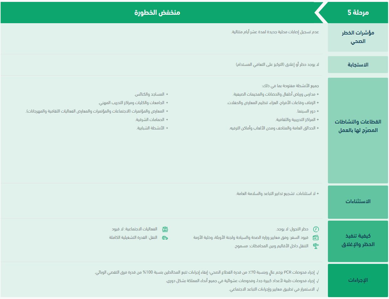 وأضافت الوزارة على لسان مسؤول ملف كورونا عدنان إسحق،بتصريحات صحفية، أنه سيتم الإكتفاء بفحص PCR للقادمين من الدول المصنفة بالمنطقة الخضراء.