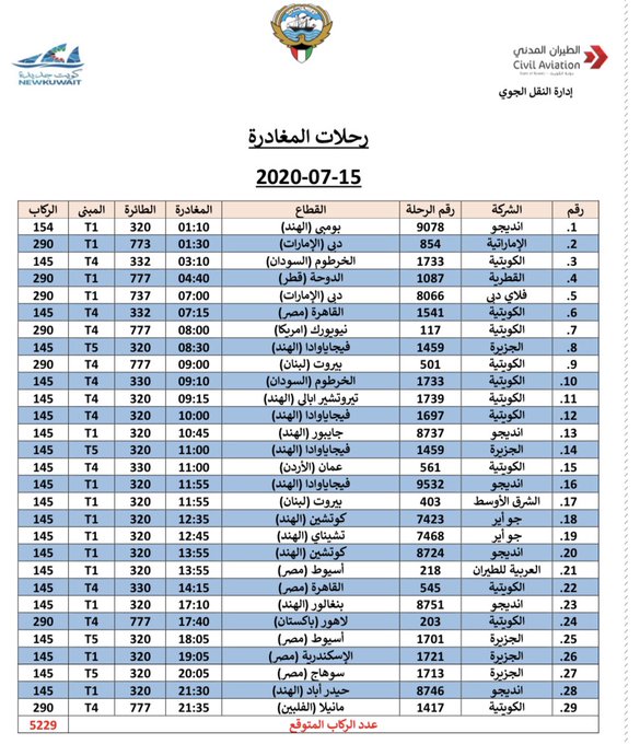 أحداث اليوم - نشر الحساب الرسمي للإدارة العامة للطيران المدني دولة الكويت، عبر صفحته الرسمية على تويتر، تفاصيل رحلات المغادرة من مطار الكويت الدولي الأربعاء ومن بينها رحلة طائرة على متنها 145 راكبا إلى الأردن.