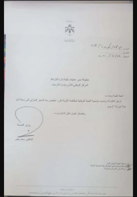 أحداث اليوم - قررت اللجنة الوطنية لمكافحة الأوبئة تخفيض مدة الحجر المنزلي إلى 7 أيام عوضا عن 14 عشر يوما. وكانت لجنة الأوبئة قد أعلنت مؤخرا رفع توصية الى وزارة الصحة بتخفيض مدة الحجر المنزلي.