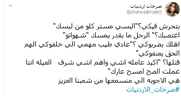 ونشرت شهد الخطيب تغريدة تستهجن تبريرات التعنيف ضد المرأة: بتحرش فيكي؟"البسي مستر كلو من لبسك" اغتصبك؟" الرجل ما بقدر يمسك "شهواتو"