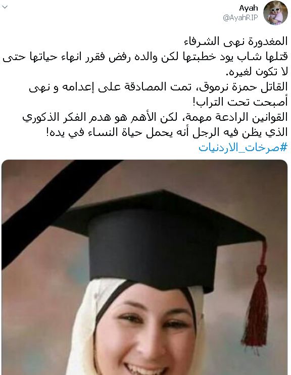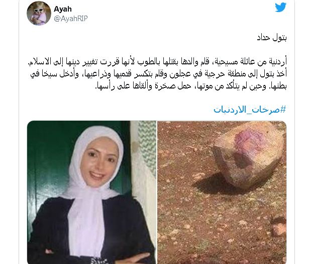 الناشطة أية استذكرت قصص لأربع أردنيات قتلوا خلال الفترة الماضية: "بتول حداد ... أردنية من عائلة مسيحية، قام والدها بقتلها بالطوب لأنها قررت تغيير دينها إلى الاسلام.