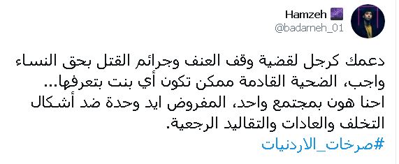 وأكد حمزة بدارنة وجوب دعم المرأة ووقف العنف ضدها: دعمك كرجل لقضية وقف العنف وجرائم القتل بحق النساء واجب، الضحية القادمة ممكن تكون أي بنت بتعرفها...احنا هون بمجتمع واحد، المفروض ايد وحدة ضد أشكال التخلف والعادات والتقاليد الرجعية.