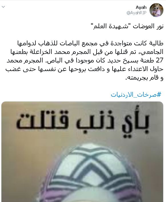 نور العوضات ... "شهيدة العلم" طالبة كانت متواجدة في مجمع الباصات للذهاب لدوامها الجامعي، تم قتلها من قبل المجرم محمد الخزاعلة بطعنها 27 طعنة بسيخ حديد كان موجودا في الباص. المجرم محمد حاول الاعتداء عليها و دافعت بروحها عن نفسها حتى غضب و قام بجريمته.