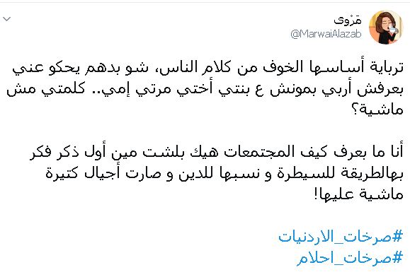 وغردت مروى الأعزب: ترباية أساسها الخوف من كلام الناس، شو بدهم يحكو عني بعرفش أربي بمونش ع بنتي أختي مرتي إمي.. كلمتي مش ماشية؟