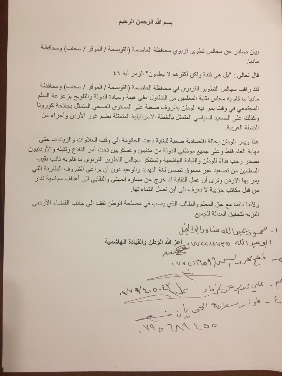 أحداث اليوم - اصدر مجالس التطوير التربوي محافظة العاصمة ( القويسمة والموقر وسحاب) ومحافظة مأدبا بياناً أكدت فيه على أن مجلس نقابة المعلمين الموقوف عن العمل قد تطال على هيبة الدولة بالتلويح بزعزعة السلم المجتمعي في وقت يمر به الوطن بظرف صعب صحياً مع جائحة كورونا.
