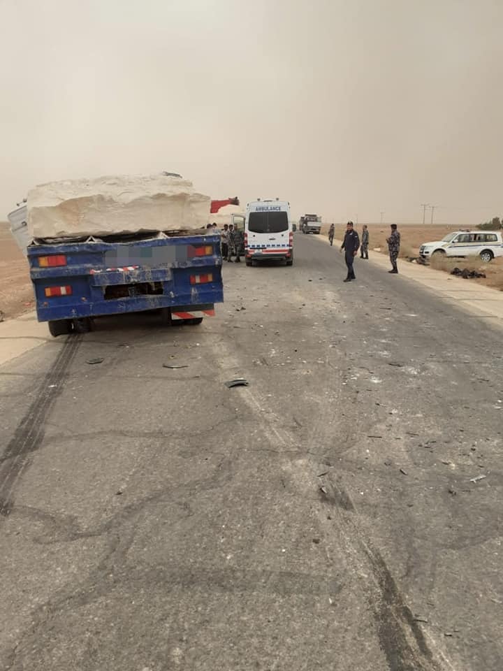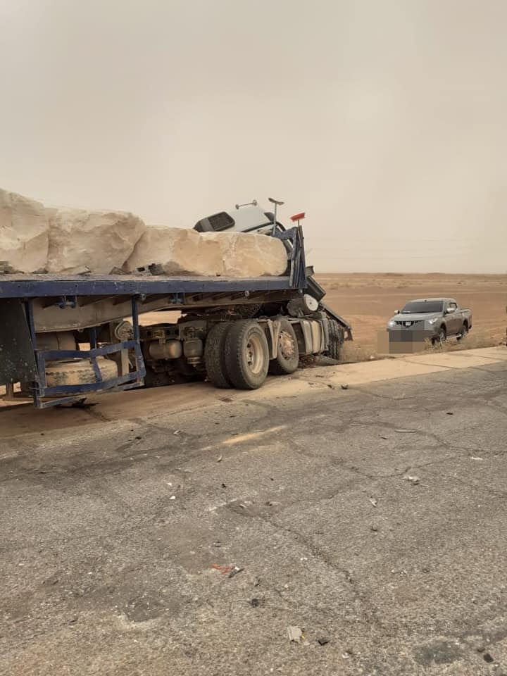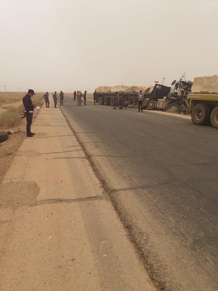 أحداث اليوم - أصيب سائق تريلا، ظهر اليوم، إثر حادث تصادم وقع بين 3 تريلات ما بعد فرع دوريات الرويشد بحوالي 5 كم باتجاه الكرامة، تم اسعاف المصاب من قبل كوادر الدفاع المدني إلى مستشفى الرويشد وحالته العامة جيدة، علما بأن المنطقة تشهد غبار متفاوت الشدة بين الحين والآخر.