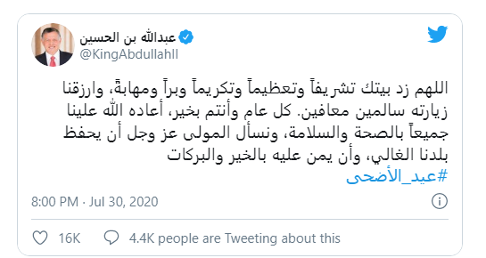وقال الملك في تغريدة له عبر تويتر، "اللهم زد بيتك تشريفاً وتعظيماً وتكريماً وبراً ومهابةً، وارزقنا زيارته سالمين معافين. كل عام وأنتم بخير، أعاده الله علينا جميعاً بالصحة والسلامة".