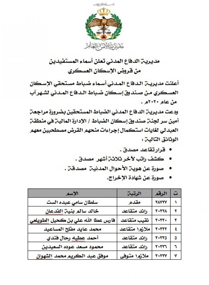 أحداث اليوم - أعلنت مديرية الدفاع المدني اليوم الثلاثاء أسماء المستفيدين من قروض الإسكان العسكري.