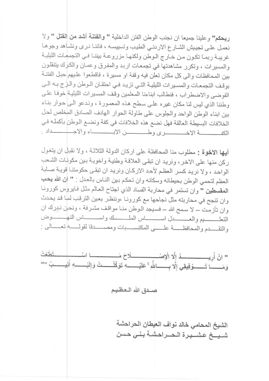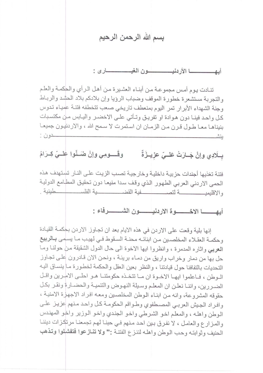تنادت يوم أمس مجموعة من أبناء العشيرة من أهل الرأي والحكمة والعلم والتجربة مستشعرة خطورة الموقف وضباب الرؤية وان بلادكم بلاد الحشد والرباط وجنة الشهداء الأبرار تمر اليوم بمنعطف تاريخي صعب تتخطفه فتنة عمياء تدوس كل واحد فينا دون هوادة أو تفريق وتأتي على الأخضر واليابس من مكتسبات بنيناها معا طول قرن من الزمان ان استمرت لا سمح الله، والاردنيون جميعا ينشدون: