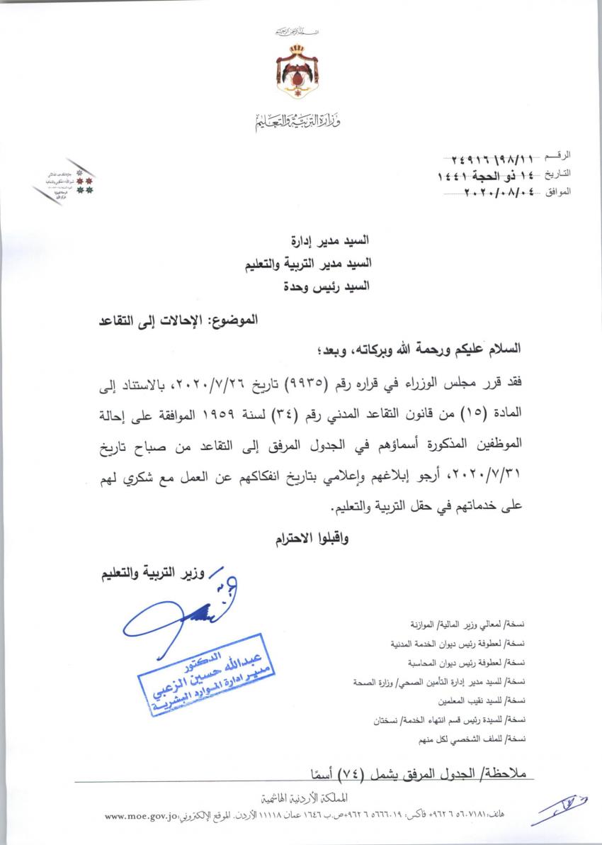 كما قرر مجلس الوزراء احالة موظفين في الوزارة إلى التقاعد اعتبارا من 31 تموز الماضي.