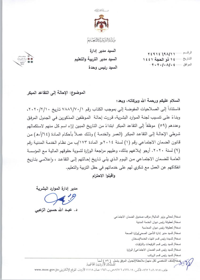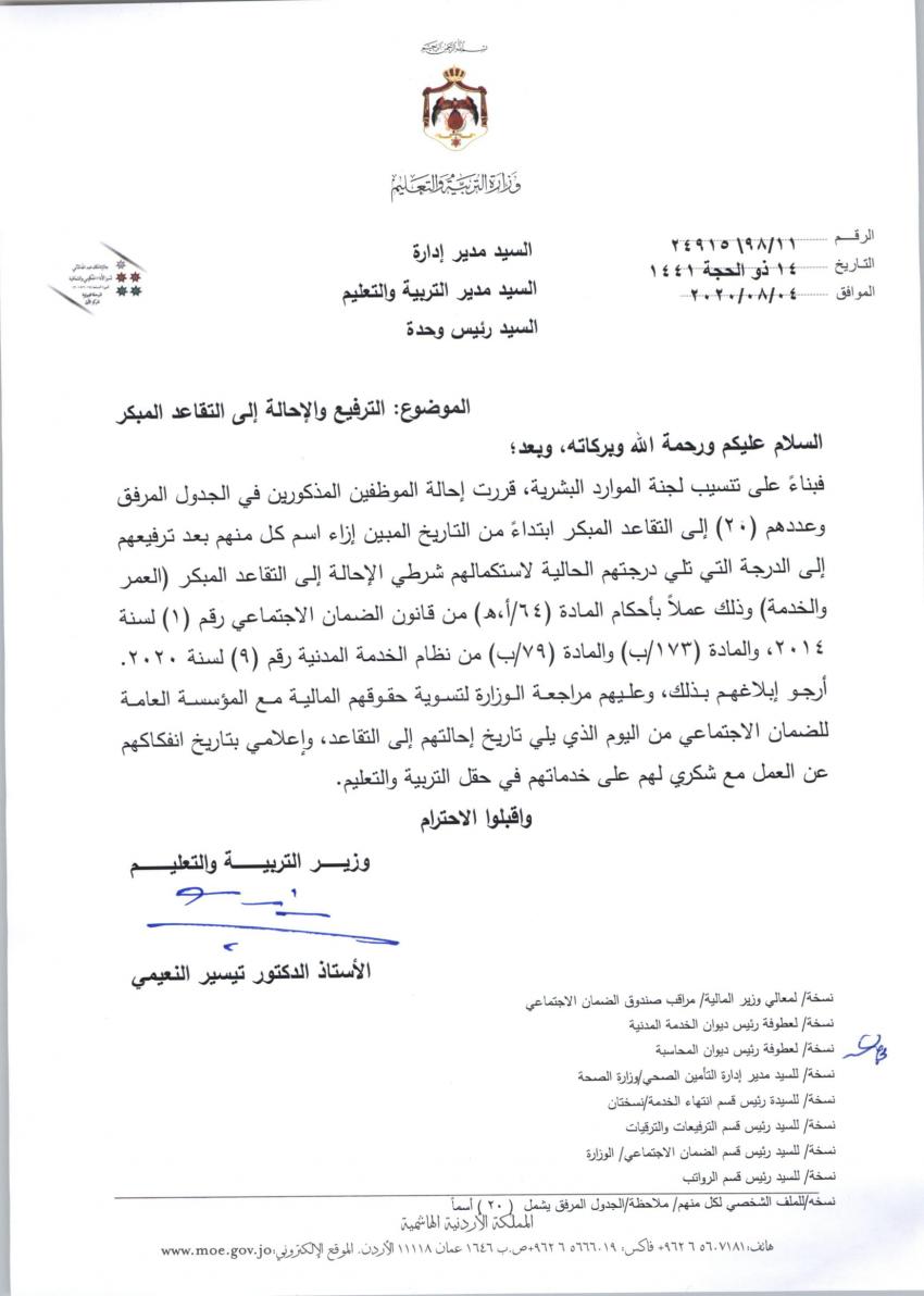 أحداث اليوم - قرر وزير التربية والتعليم تيسير النعيمي وبناء على توصية دائرة الموارد البشرية في وزارة التربية والتعليم احالة موظفين إلى التقاعد المبكر بعد ترفيعهم إلى الدرجة التي تلي درجتهم، فيما قرر احالة آخرين إلى التقاعد المبكر دون ترفيع.