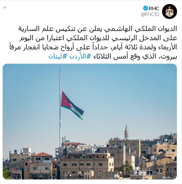 أحداث اليوم - أعلن الديوان الملكي الهاشمي عن تنكيس علم السارية على المدخل الرئيسي للديوان الملكي اعتبارا من اليوم الأربعاء ولمدة ثلاثة أيام، حداداً على أرواح ضحايا انفجار مرفأ بيروت، الذي وقع أمس الثلاثاء..