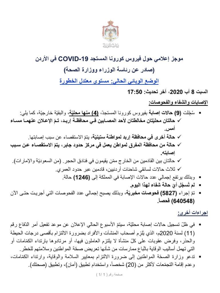 وبذلك يرتفع اجمالي عدد الاصابات التي سجلت في الاردن الى 1246 اصابة منذ بداية الجائحة