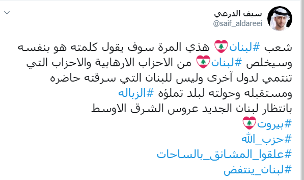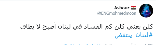 على ذات الصعيد تفاعل نشطاء عرب بشكل واسع مع هذه المظاهرات ودشنوا وسم " لبنان ينتفض" معبرين عن تضامنهم مع الشعب اللبناني الذي عاش تحت وطأة الفساد والتصفيات السياسية والمصالح الشخصية.