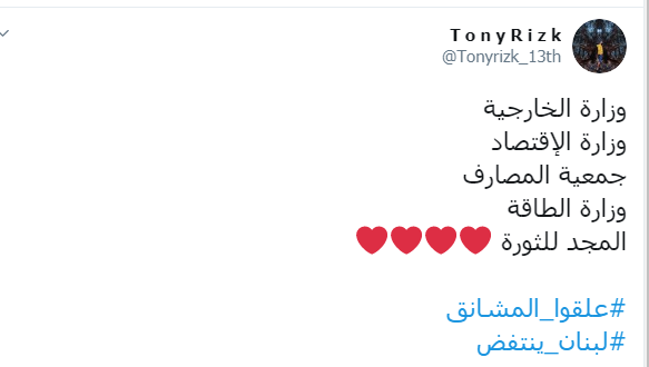 وعلّق النشطاء في شوارع بيروت "مشانق رمزية" وضوعوا عليها صوراً للمسؤولين ودشنوا وسم " علقوا المشانق" للتعبير عن غضبهم ومطالبتهم برحيل النظام الحاكم في لبنان واعتبار كل السياسيين مجرمين.