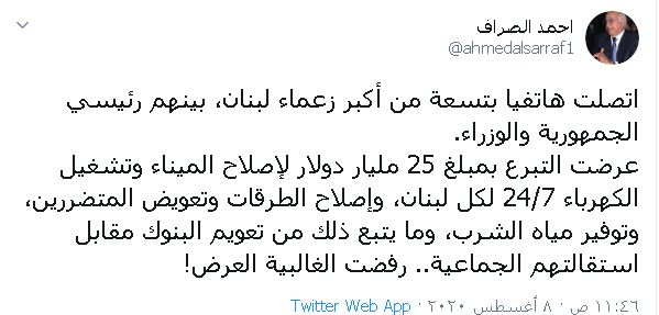 أحداث اليوم - سخر رجل الأعمال الكويتي احمد الصراف من حجم التفعال على تغريدة نشرها عبر "تويتر" بين فيها انه اتصل بتسعة من أكبر زعماء لبنان، بينهم رئيسا الجمهورية والوزراء. عرضت التبرع بمبلغ 25 مليار دولار لإصلاح الميناء وتشغيل الكهرباء 24/7 لكل لبنان، وإصلاح الطرقات وتعويض المتضررين، وتوفير مياه الشرب، وما يتبع ذلك من تعويم البنوك مقابل استقالتهم الجماعية... رفضت الغالبية العرض!.