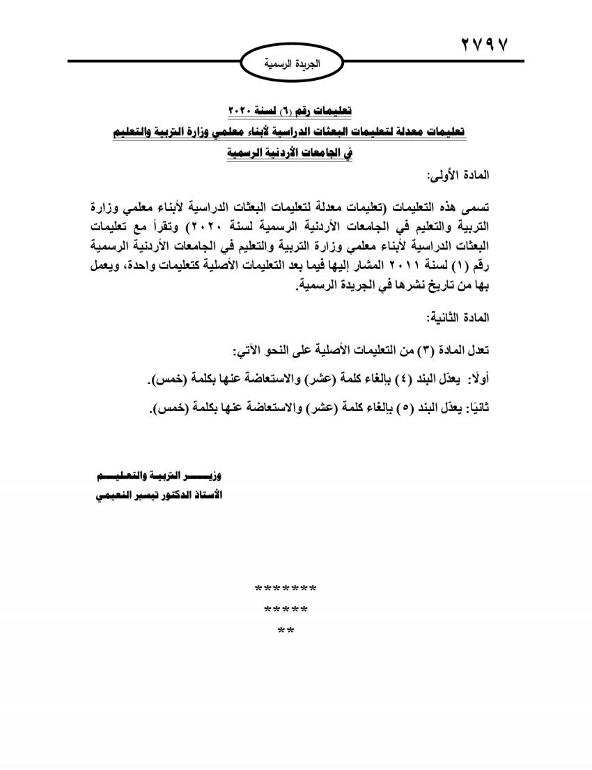 أحداث اليوم - خفضت وزارة التربية والتعليم مدة خدمة المعلمين المستفيدين من مكرمة أبناء المعلمين من البعثات الدراسية في الجامعات لتصبح (5) سنوات بدلا من (10)؛ وذلك بحسب عدد الجريدة الرسمية الصادر اليوم الأحد.
