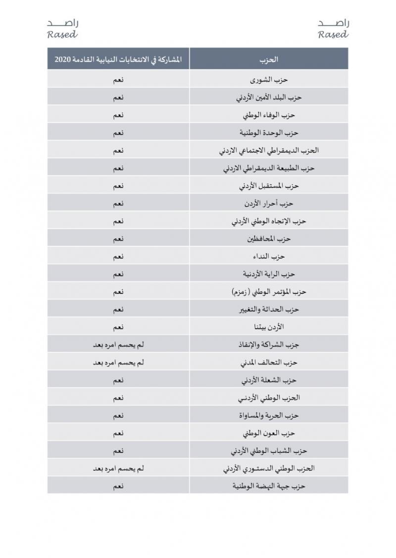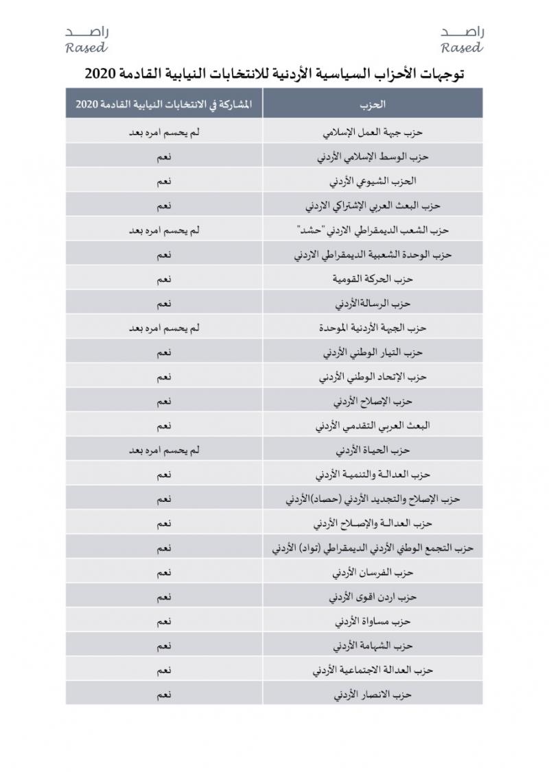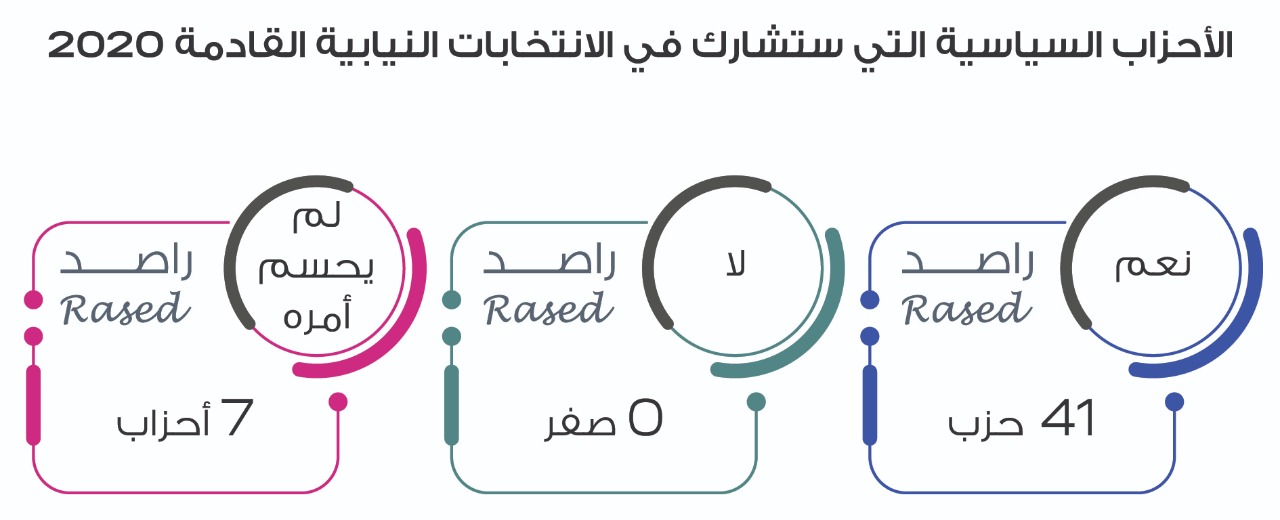 أحداث اليوم - أظهرت دراسة أجراها مركز "راصد" أن عدد الأحزاب السياسية التي تنوي المشاركة في الانتخابات النيابية القادمة قد وصل 41 حزباً من أصل 48 حزبا مرخصا، فيما وصل عدد الأحزاب التي لم تحسم أمرها بعد بما يتعلق في المشاركة بالترشح للانتخابات النيابية القادمة إلى 7 أحزاب سياسية.