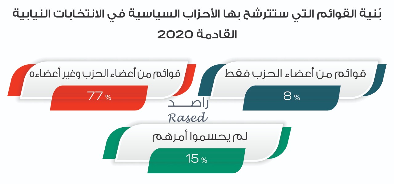 وبحسب الدراسة التي وصلت "جراسا" ، فإنه فيما يتعلق بتركيبة القوائم الانتخابية التي ستترشح بها الأحزاب السياسية فقد عَبّر ما نسبته 8%من الأحزاب بأنهم ينوون الترشح بقوائم من أعضاء الحزب فقط، فيما عبّر ما نسبته 77%من الأحزاب السياسية أنهم سيترشحون من خلال قوائم مختلطة ما يعني أن المترشحين في القائمة سيكونون من أعضاء الحزب وخارجه، فيما لم يحسم ما نسبته 15%من الأحزاب السياسية قرارهم في آلية بناء القوائم الانتخابية.