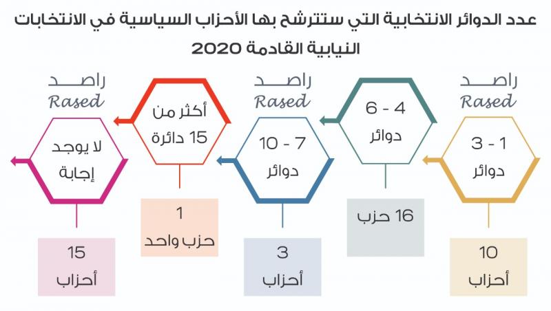 وبخصوص تعداد الدوائر الانتخابية التي ستترشح بها الأحزاب السياسية، أفاد 13حزباً بأنهم ينوون الترشح بـ دائرة انتخابية واحدة إلى ٣ دوائر انتخابية، وأفاد 16حزباً بأنهم ينوون الترشح بـ (4إلى 6) دوائر انتخابية، بينما أشار 3أحزاب أنهم ينوون الترشح بـ (7إلى 10) دوائر انتخابية، بينما عبّر حزباً واحداً عن نيته الترشح في أكثر من 10دوائر انتخابية، فيما لم يحسم 15حزباً أمرهم بعد فيما يتعلق بتعداد الدوائر الانتخابية التي سيترشحون بها.