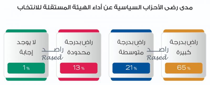 أما فيما يتعلق بدرجة رضا الأحزاب السياسية عن أداء الهيئة المستقلة للانتخاب فقد أظهرت النتائج أن 65%من الأحزاب السياسية راضون بدرجة كبيرة عن أداء الهيئة المستقلة للانتخاب، فيما قال 21%من الأحزاب السياسية أنهم راضون بدرجة متوسطة عن أداء الهيئة المستقلة للانتخاب، وعبر13%من الأحزاب بأنهم راضون بدرجة محدودة عن أداء الهيئة المستقلة للانتخاب، ولم يجب 1%من الأحزاب السياسية عن هذا السؤال.