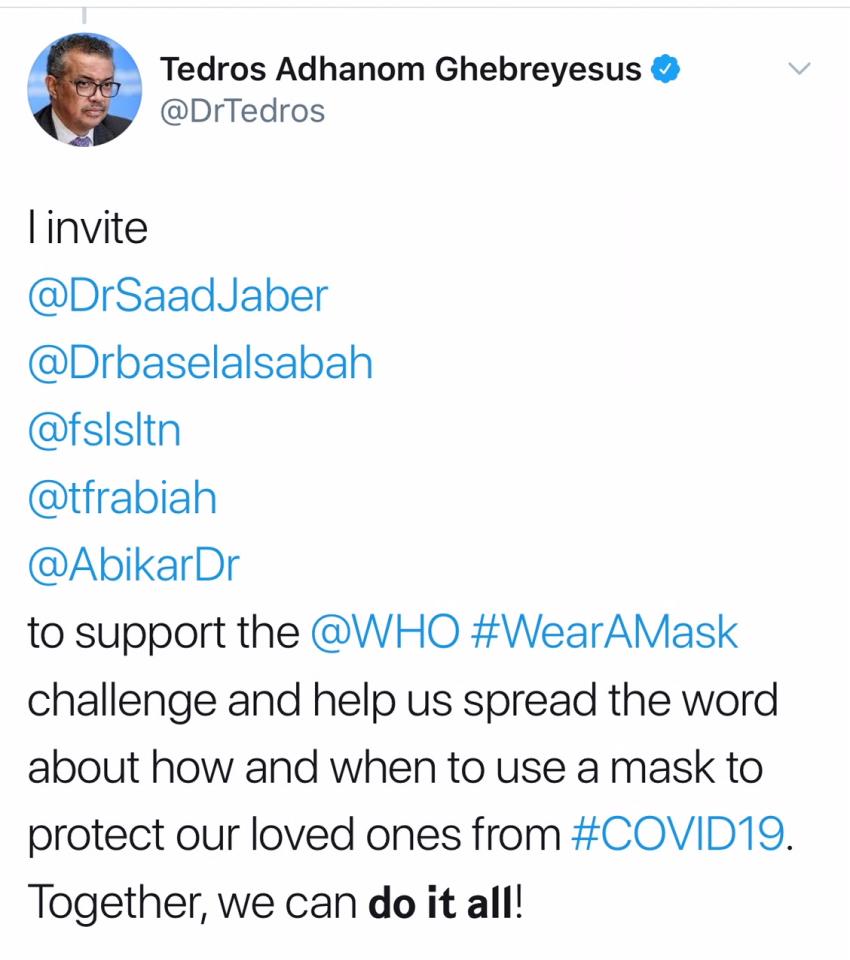 دعا المدير العام لمنظمة الصحة العالمية الدكتور تيدروس أدهانوم غيبريسوس قائمة من الأسماء لشخصيات عامة معروفة ومؤثرة على المستوى الوطني والعالمي لتحدي ارتداء الكمامة، حيث تصدّر اسم وزير الصحة الدكتور سعد جابر قائمة الأسماء المدعوة لقبول التحدي.