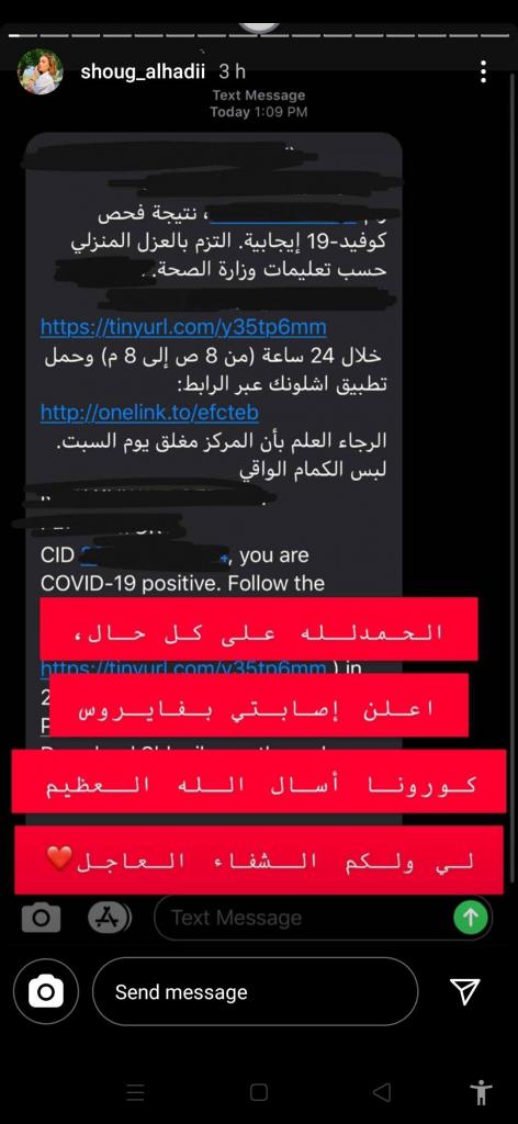 شوق الهادي كتبت في منشور لها عبر حسابها في خاصية الاستوري على موقع "إنستغرام": "الحمد لله على كل حال أعلن إصابتي بفيروس كورونا، أسأل الله العظيم لي ولكم الشفاء العاجل".