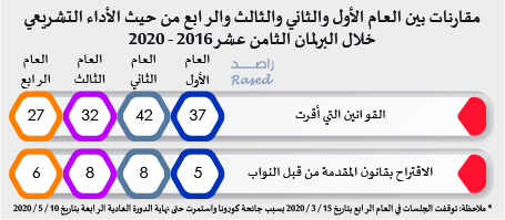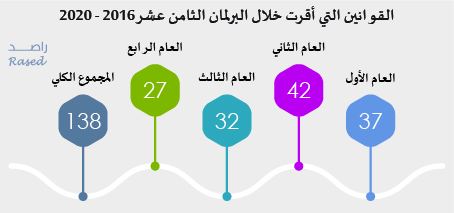 وفيما يتعلق بالجانب التشريعي فقد أقر المجلس الثامن عشر خلال 170 يوم عمل تشريعي 138 قانوناً، فيما قدم المجلس 27 اقتراح بقانون أقر منها اقتراحين بقانون، وبمقارنة القوانين التي تم إقرارها في المجلس الثامن عشر مع المجلس السابع عشر نرى بأن المجلس السابع عشر أقر 175 قانوناً فيما قدم 57 اقتراحاً بقانون.