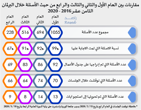 أما على الصعيد الرقابي فقد قدم المجلس الثامن عشر خلال الأربع سنوات 2493 سؤالاً أجابت الحكومة على 92% منها، أما عدد الأسئلة التي تم إدراجها على جدول الأعمال فقد وصل تعدادها إلى 330 سؤالاً نوقش منهم 274 سؤالاً، فيما يبين التقرير أن عدد الأسئلة التي قدمها المجلس النيابي السابع عشر فقد وصل 3095 سؤالاً.