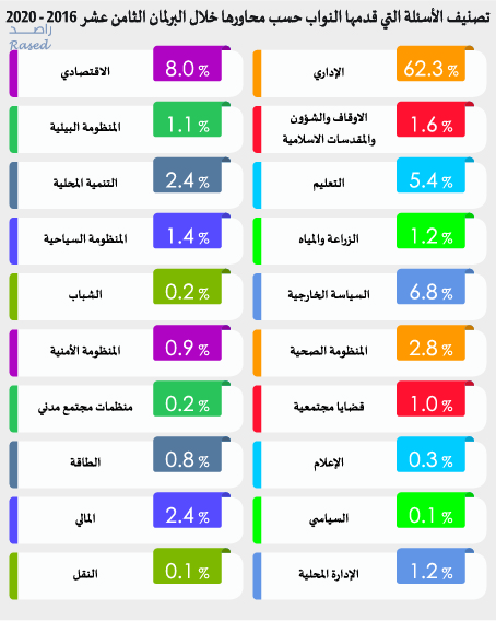 وفيما يتعلق بمحاور الأسئلة النيابية كان المحور الإداري الأكثر تقديماً للأسئلة بنسبة وصلت إلى 62.3% تلاه المحور الاقتصادي بنسبة وصلت إلى 8% من مجموع الأسئلة، ووصلت نسبة الأسئلة المقدمة في محور الشباب إلى 0.2% فقط من مجموع الأسئلة.